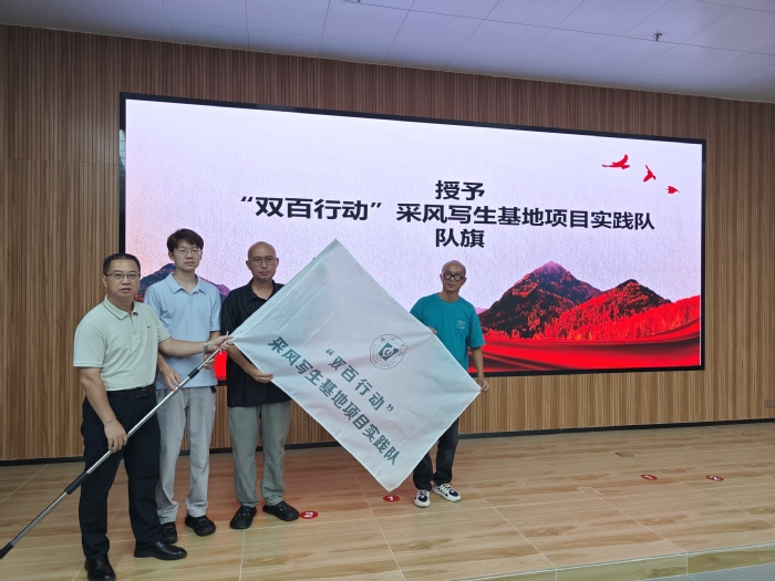 活动由美术与设计学院教工第二党支部书记吴冠聪主持,分两个阶段进行。第一阶段为“双百行动”采风写生基地项目实践队出征仪式。会上,张一凡老师详细介绍了基地建设背景、目标定位及预期成果。邓育明书记向实践队郑重授旗,标志着2025年“双百行动”采风写生基地项目正式启动。刘国栋副校长作动员讲话,他首先介绍了林寨镇历史及惠州学院一直以来在林寨镇开展的“双百行动”工作;接着,他向实践队提出了要明确目标、端正态度、产出成果、注意安全四点要求,并勉励师生以饱满的热情投身基层一线,用画笔记录乡村振兴壮美画卷,为“双百行动”贡献惠院艺术力量。