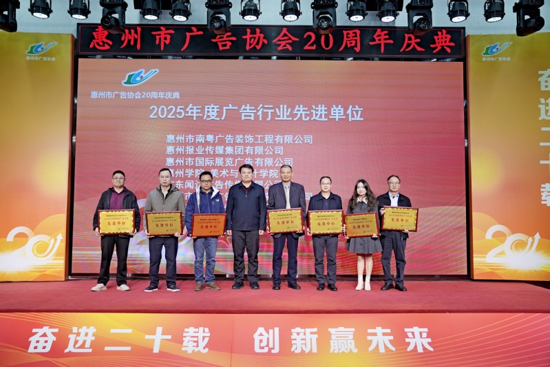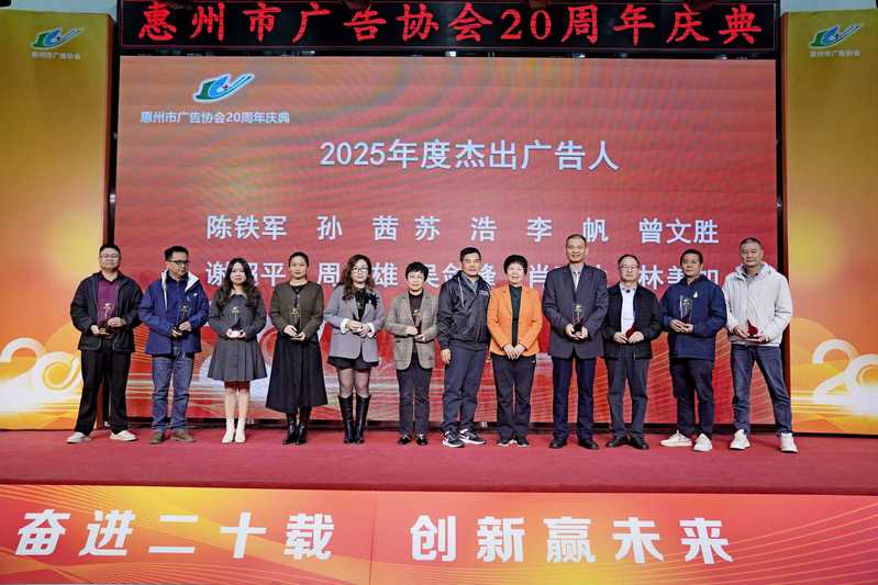 本次庆典汇聚行业主管部门、广东省广告协会、各地市广告协会及兄弟协会代表近300人,共话行业发展新机遇。惠州市广告协会会长陈铁军回顾协会二十载发展路,强调始终秉持 “服务会员、服务行业、服务社会” 宗旨,发挥政企桥梁纽带作用;提出未来将夯实服务平台,引导行业把握数字化、智能化趋势,加强人才培养与跨界合作。