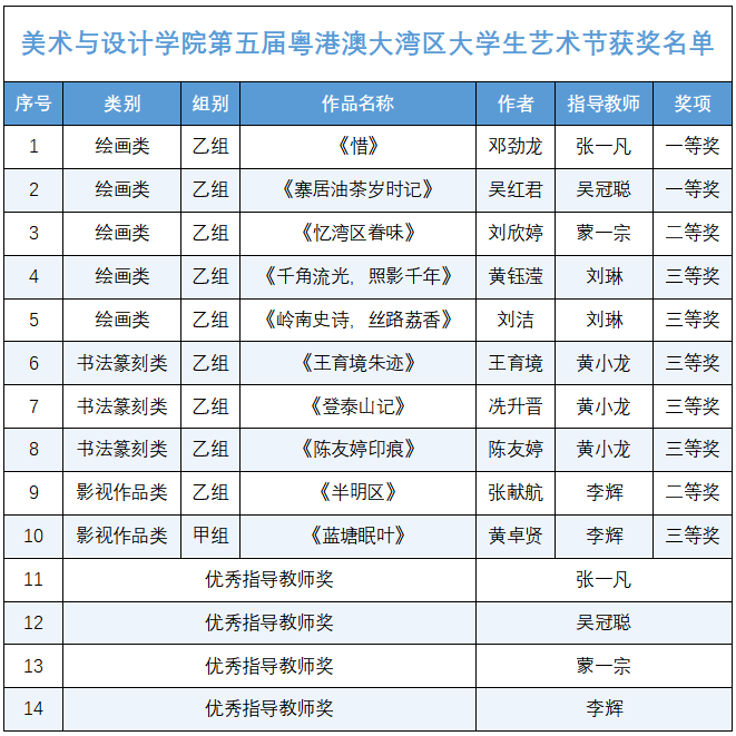 近日,由广东省教育厅主办的第五届粤港澳大湾区大学生艺术节获奖名单正式揭晓。惠州学院美术与设计学院学子在本次艺术节中表现优异,共获14个奖项,其中一等奖2项、二等奖2项、三等奖6项,并有4位教师获“优秀指导教师奖”。