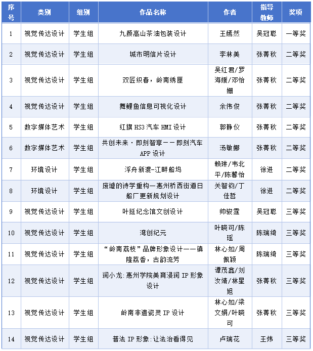 此次辉煌战绩,是学院长期坚持“德美双育·学赛联动”人才培养模式的生动体现,也是学院学科建设与专业发展成果的一次集中检阅。尤为值得一提的是,这些扎实的成果为学院高层次设计人才培养奠定了坚实基础。未来,学院将继续深化教学改革,强化产学研用结合,进一步鼓励师生将艺术创作与社会需求、湾区发展紧密结合,为粤港澳大湾区的文化繁荣、产业升级与设计创新贡献更多“惠院智慧”与“惠院方案”。