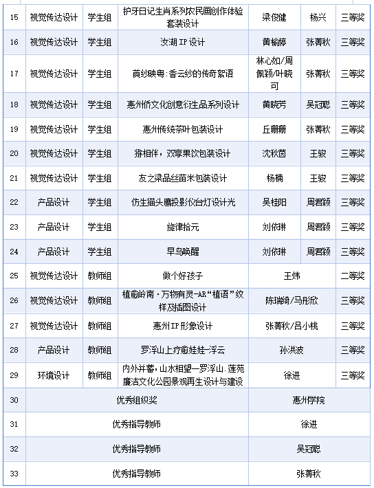 近日,由广东省教育厅主办的第八届粤港澳大湾区学校设计作品展暨第十届广东省高校设计作品学院奖双年展评选结果已公示。惠州学院美术与设计学院在此次赛事中表现卓越,师生作品共计斩获33项奖项,其中一等奖1项、二等奖8项、三等奖20项,3位教师获评优秀指导教师,惠州学院荣获优秀组织奖。获奖总数、等级及覆盖类别均创历史新高。